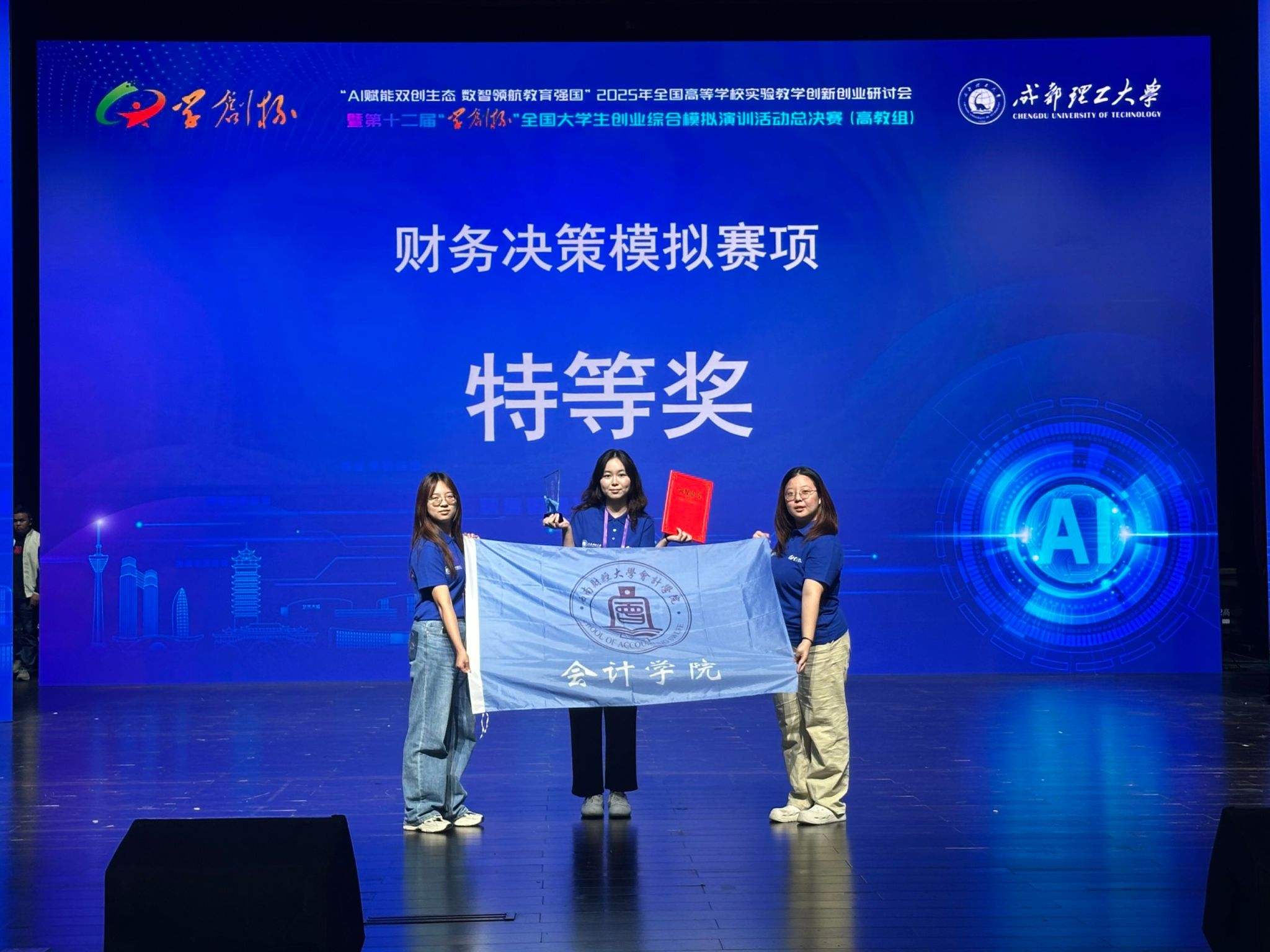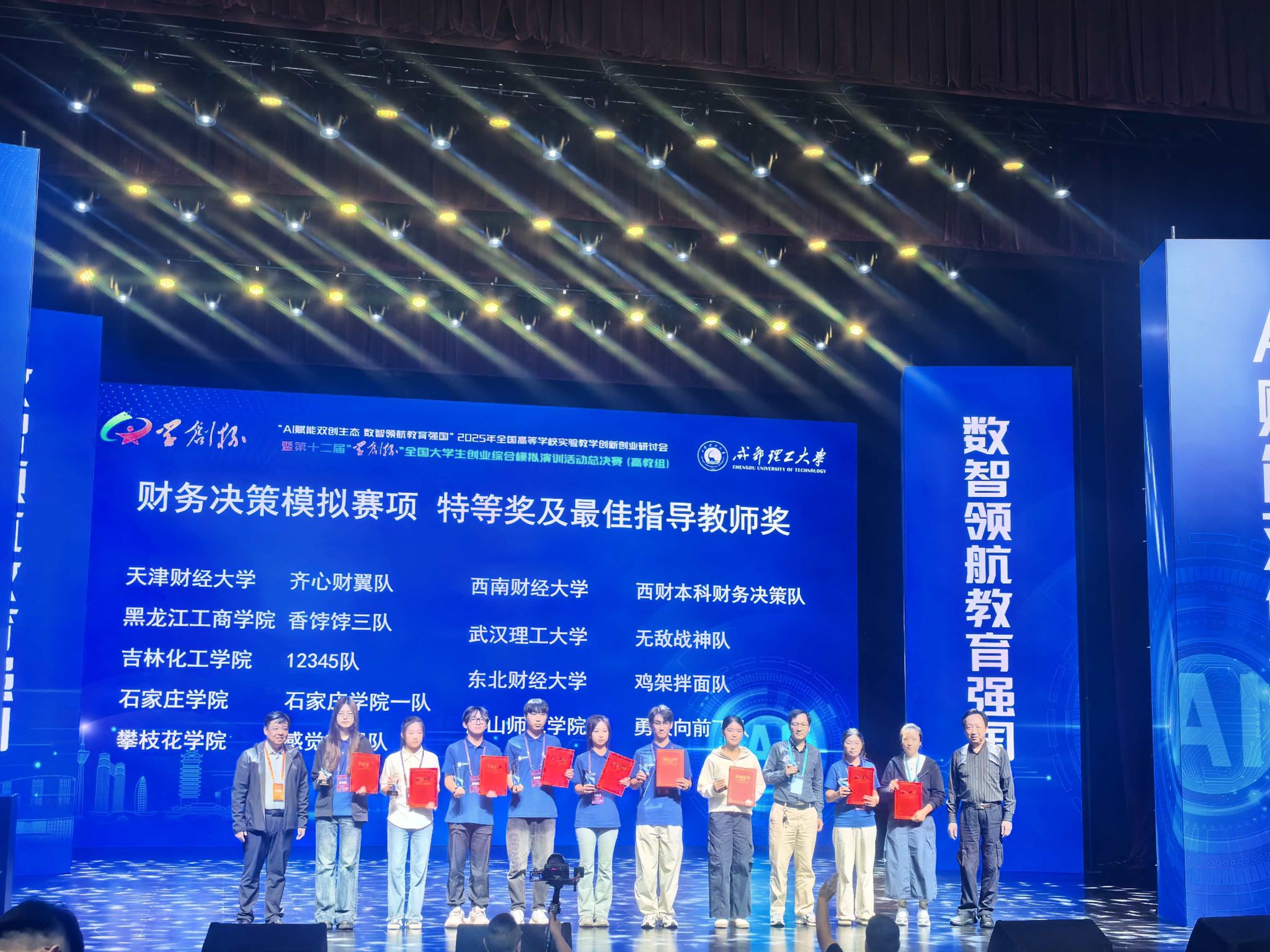 2025年10月19日,第十二届“学创杯”全国大学生创业综合模拟大赛总决赛在成都理工大学圆满落幕。本届大赛规模空前,吸引了全国1500余所高校、超过10万支团队参与。经过校赛、省赛的层层选拔,共有来自221所高校的287支队伍晋级全国总决赛。在邹燕、贾晓莉、吴瑞恩、任婷教师团队的指导下,我校学生陈嘉玲、羊冰瑞、樊响组成的“西财本科财务决策队”表现卓越,在竞争激烈的财务决策模拟赛项中脱颖而出,荣获全国特等奖。另有2支队伍荣获创业综合模拟赛项和财务决策模拟赛项的全国二等奖。