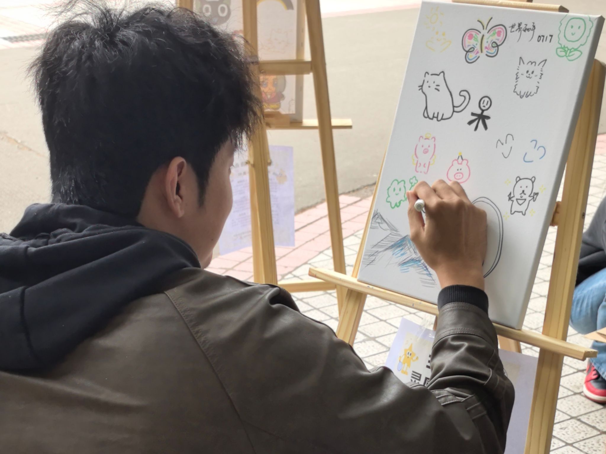 活动现场设有三个画架,旁边的桌上整齐摆放着马克笔、颜料等创作工具,并同步设置【主题灵感指南】与【轻任务卡】,帮同学们轻松打开思路。路过的学生可即兴添笔,伙伴们也能组队创作,无需专业技巧,鼓励随心表达,切实将心理关怀融入轻松有趣的互动之中。活动过程中气氛热烈而温馨,有同学用亮色勾勒笑脸,有同学用线条传递鼓励,有同学笔下跳出灵动的小猫咪,也有同学绘出热门动漫角色,用多元画风传递治愈力量。大家在画布上留下对校园的热爱、对未来的期许,更有陌生人之间的温暖致意。空白画框在接力创作中逐渐饱满多彩,“你画一笔,我添一色”的模式不仅让创作过程充满了未知的惊喜,更让每幅作品成为集体情感的鲜活载体,传递心灵慰藉的独特媒介。