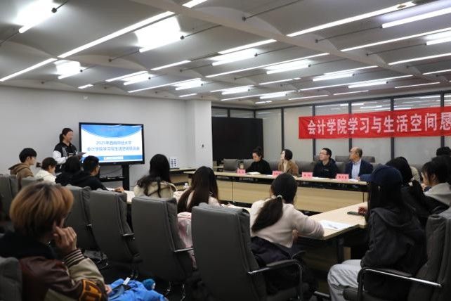 11月25日下午,西南财经大学会计学院2025年度学习与生活空间恳谈会在诚正楼650会议室举行。学院副院长易阳,学院党委副书记、纪委书记张太富、本科教学管理办公室主任王路菲、研究生教学管理办公室主任王旭、团委副书记刘砚琛、团委学生会指导老师杨凌峰、张博涵出席,学院团委学生会成员、各班级学习与生活委员和学生代表参会。