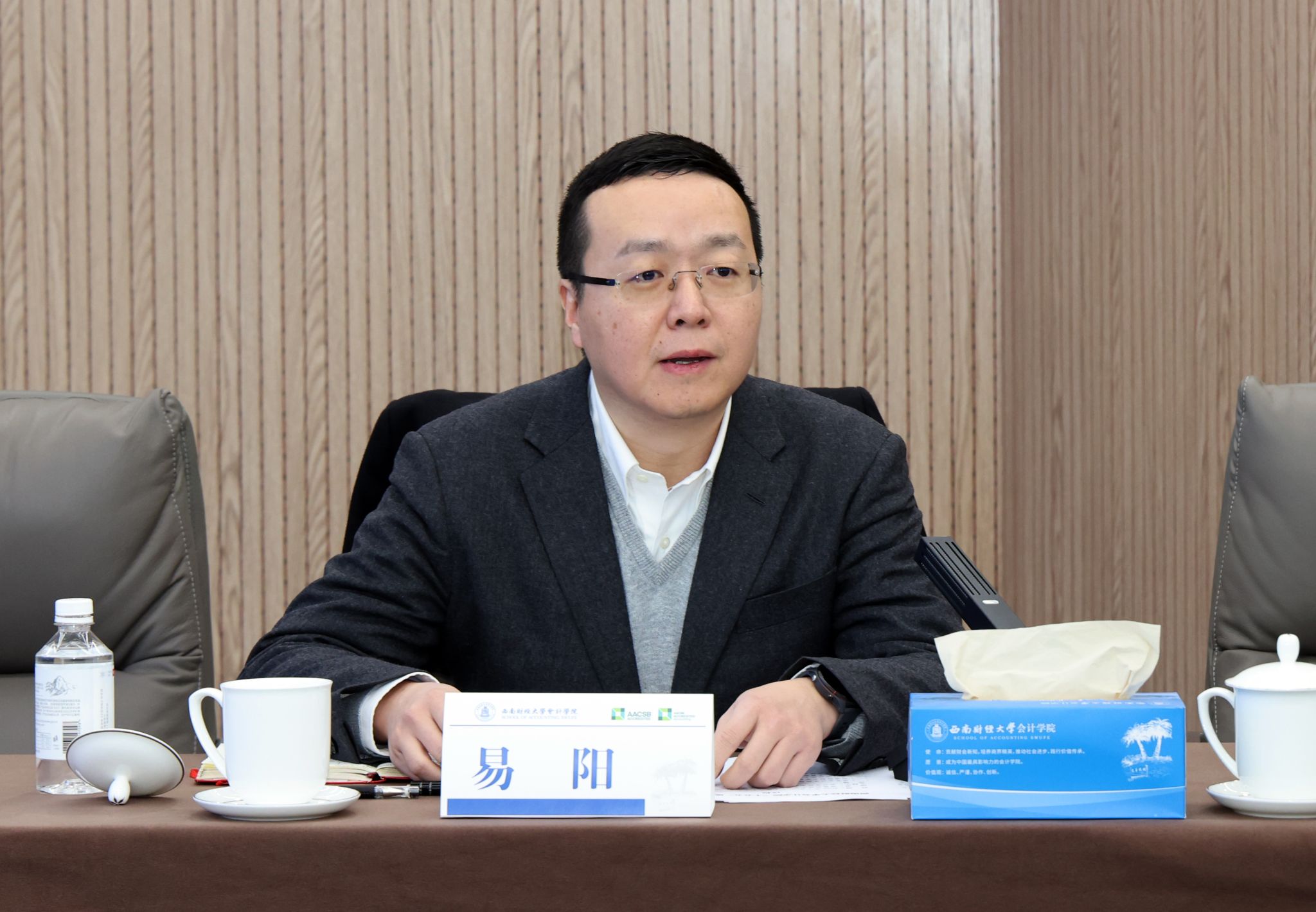 随后,学院副院长易阳系统汇报了学院“十四五”期间取得的显著成就,并详细阐述了“十五五”发展规划的初步构想,围绕学校第十四次党代会部署,聚焦高质量推动建成“国内顶尖、国际知名的拔尖创新人才育人新标杆、商科学术与社会服务新高地、中国特色财会教育新典范”的总体目标提出了发展思路与重点任务举措,为后续深入交流奠定了基础。