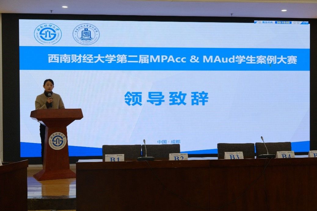 在决赛现场,会计学院党委副书记杨长虹发表致辞。她指出,本次案例大赛旨在推动理论教学与商业实践的深度融合,切实提升学生解决实际问题的能力。杨书记肯定了各参赛队伍在初赛、复赛阶段展现出的敏锐行业视角与扎实调研功底,强调决赛既是对专业素养的全面检阅,也是对临场应变与思辨能力的综合锻炼。她勉励同学们在赛场上保持自信与谦逊,充分珍惜这一“以赛促学”的成长平台,以此次大赛为契机,在积累经验中锤炼专业本领,为未来职业发展打下坚实基础。