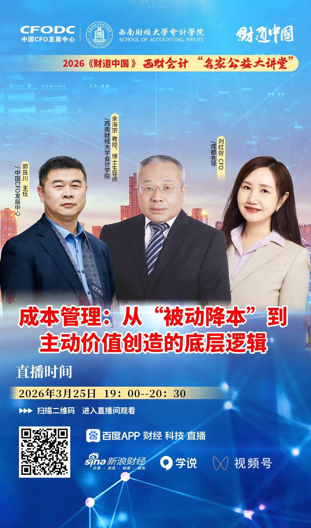 3 月 25 日晚 19 时,由西南财经大学会计学院与中国 CFO 发展中心联合打造的“财道中国”——“西财会计・名家公益大讲堂”系列直播正式启动。首期直播以 “成本管理 —— 从被动降本到主动价值创造的底层逻辑” 为主题,西南财经大学会计学院余海宗教授、成都先导药物开发股份有限公司首席财务官刘红哿女士联袂开讲,中国 CFO 发展中心主任郭良川先生担任主持人,为全国财务从业者呈现了一场兼具学术深度与实践价值的专业分享,吸引了全国6000余名制造业、科技、医药、零售等多行业企业经营者、财务高管及高校师生在线观看,反响热烈。
