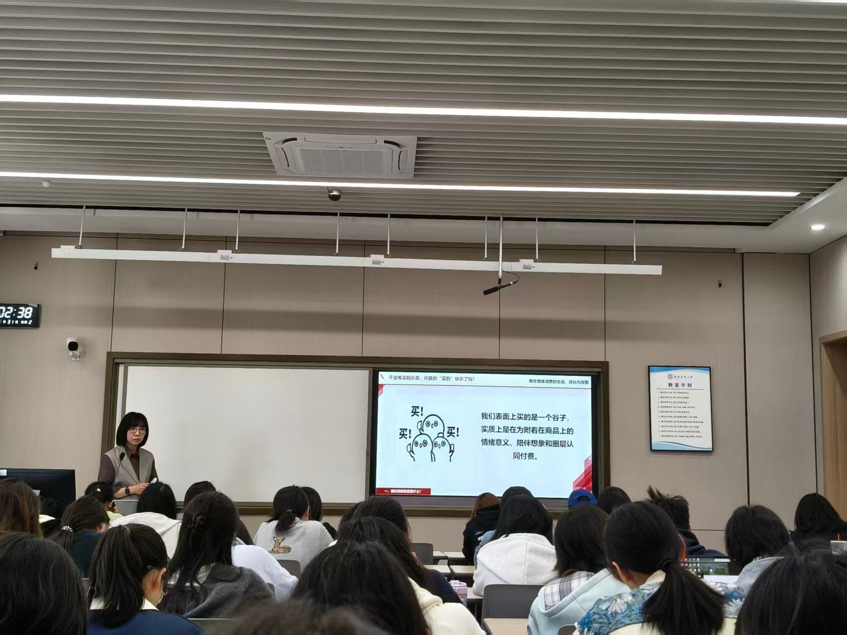 针对这一现实困境,吴姗老师积极引导学子构建理性的“快乐平衡公式”。她强调,青年要重新掌握消费主动权,通过批判性思考辨析真实需求与外界植入的欲望,让消费行为与个人成长、社会价值实现深度绑定,让消费真正服务于人的全面发展。最后,吴姗老师总结道,真正的成长在于让消费服务于人的健全发展,而非让人的价值被消费符号所定义,其核心是守护内心选择的自由,避免快乐与情感被资本标准化、定价化。