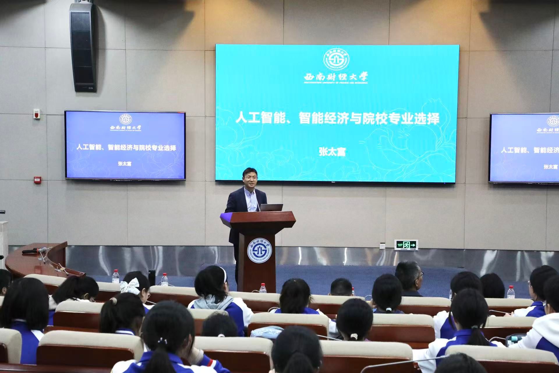 当天上午,汤火箭代表学校对两校师生的到来表示热烈欢迎,并围绕学校发展概况、办学特色及人才培养成效作整体介绍。张太富以《人工智能、智能经济与院校专业选择》为题,从智能经济时代对财经人才的新需求出发,结合院校与专业选择策略,与两校师生进行了深入交流。孙毓璘则从日常生活中的经济现象切入,用生动案例帮助同学们直观理解“什么是财经”,感受学科魅力,激发专业兴趣。