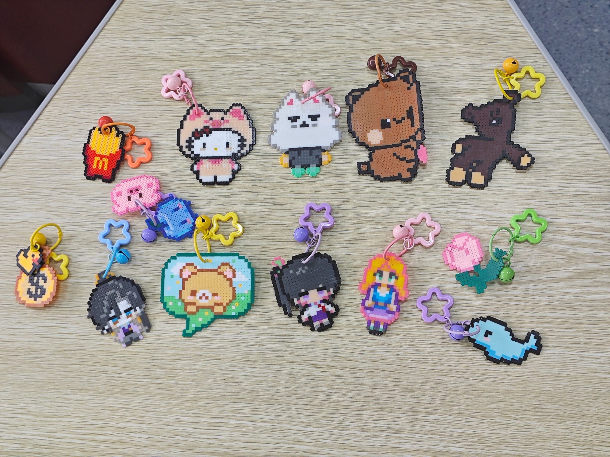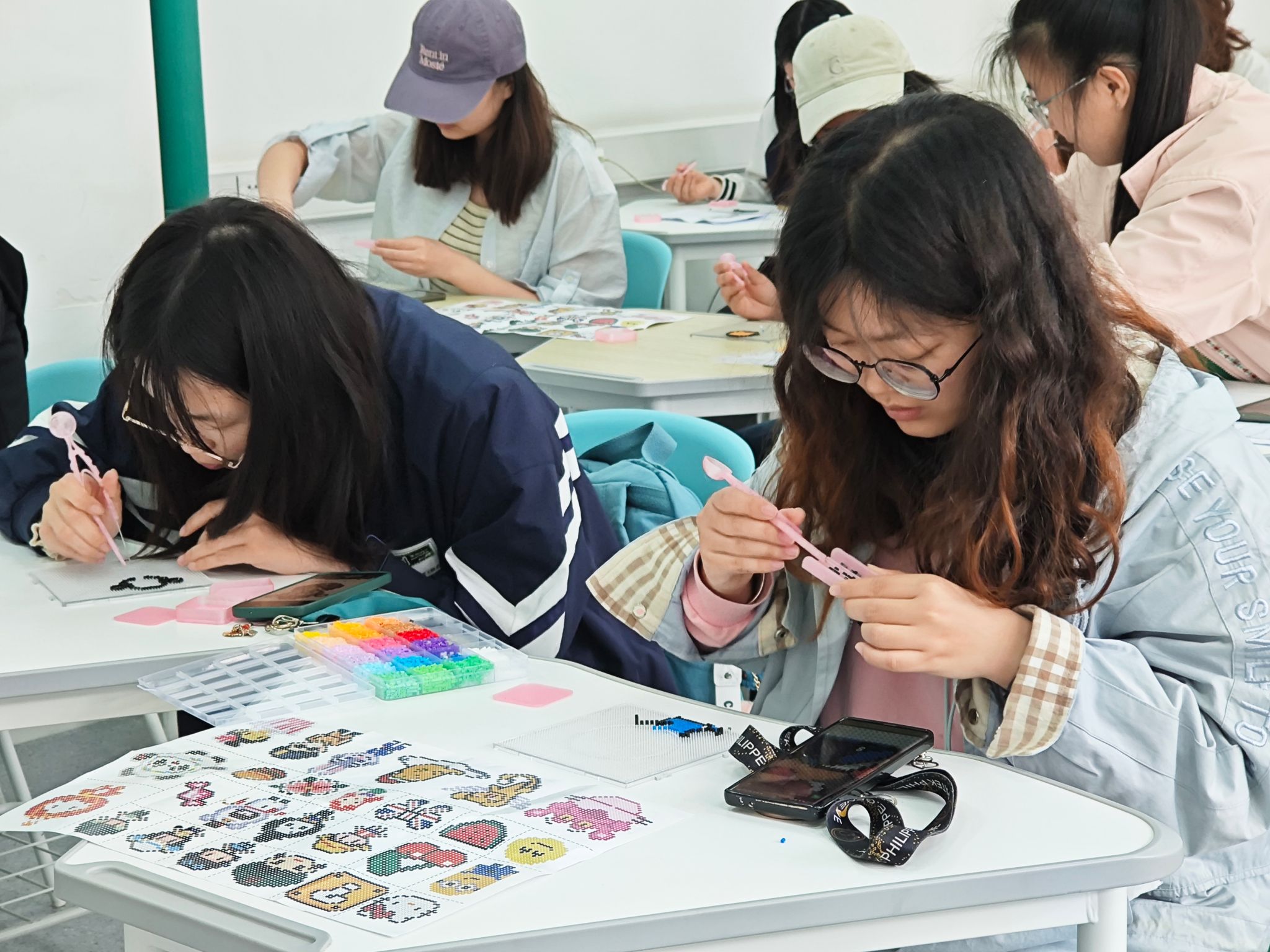 活动现场,色彩缤纷的拼豆整齐陈列,平整的底板铺就创作天地,精巧的镊子开启疗愈时光,为这场心灵之约营造出温柔治愈的氛围。同学们随心挑选心仪色彩,或循着模板梳理秩序,或凭灵感勾勒专属图景,执起镊子在底板上凝神创作,在专注中与自我温柔对话。一夹一放,安放浮躁心绪;一拼一凑,梳理纷乱思绪;一点一抹,凝聚斑斓美好。灵动的萌宠渐渐成型,可爱的卡通跃然眼前,零散的彩豆汇聚成完整画卷,焦虑与疲惫也在指尖忙碌中悄然消融。工作人员悉心协助,用低温熨斗轻熨融合,让颗颗彩豆牢牢定型,再缀上钥匙扣环,一件件饱含温度的手作就此落成。教室内静中有乐,大家交流创作心得、分享拼搭巧思,在相伴中驱散孤单,在共鸣中收获温暖。