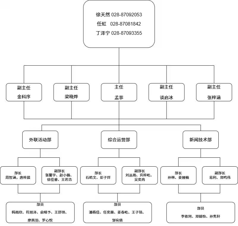 会计学院校友工作中心设置指导老师—中心主任—职能部门—部门负责人—部门成员的多环监督体系,确保工作执行高效有序。根据活动特点设立综合运营部、外联活动部、新闻技术部三个职能部门,实行轮岗制度,全面培养组织成员能力。