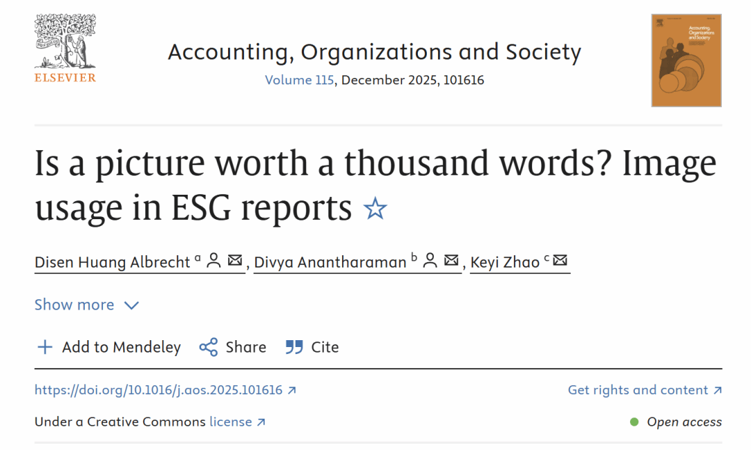 我院赵珂意老师与合作者的论文《Is a picture worth a thousand words? Image usage in ESG reports》在国际会计学顶刊《Accounting, Organizations and Society》正式发表。