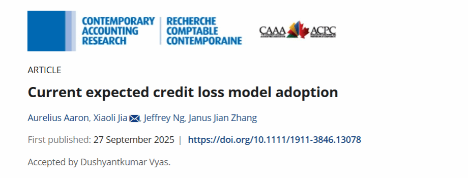 我院贾晓莉副教授与合作者的论文《Current expected credit loss model adoption》在国际会计学顶刊Contemporary Accounting Research正式发表。