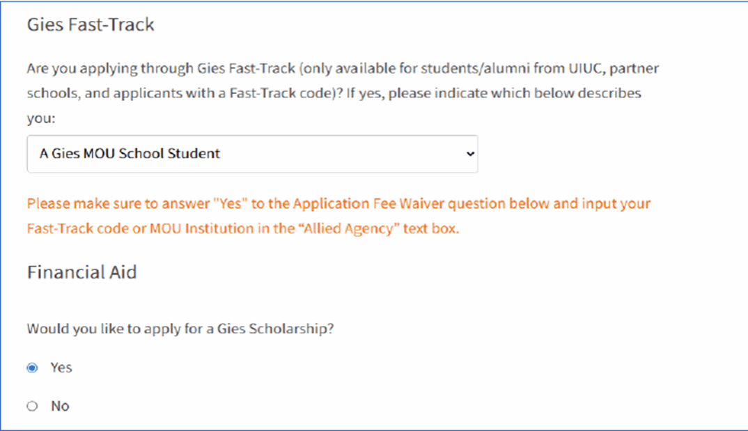 1.同时满足四项申请要求的申请人请在2026年1月15日前登录choose.illinois.edu/apply完成申请--并注意:在“Program”-“Gies Fast-track” 中选择“A Gies MOU School Student”;在“Financial Aid”下选择“Yes”(要考虑获得奖学金机会必须选择Yes);在“if you are affiliated with an Allied Agency, please list the agency name.”下填写“SWUFE”;