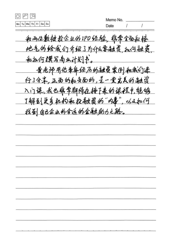在实务操作环节,黄老师系统梳理了股权融资的完整流程 :从制定融资计划、撰写商业计划书、寻找匹配的投资机构,到初步接触、尽职调查、商务谈判、签署协议、投后管理与退出,每一步都配以实操要点与注意事项。他还深入讲解了投资尽调的三大板块——