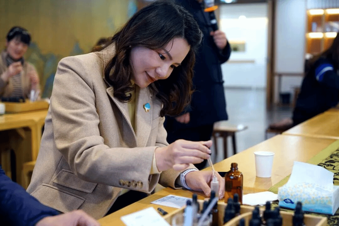 随后的颂钵疗愈环节,在专业指导下,学员们在舒缓的钵音与声波共振中放松身心,暂时卸下学业与生活的压力,在静谧的氛围中实现身心灵的舒缓与调节。颂钵体验结束后,中药芳香精油调香实践成为核心体验环节,在专业导师讲解中药香料特性、精油搭配原则后,学员们结合自身喜好,甄选天然中药香料萃取的精油,亲手调配专属香氛,在动手操作中进一步感受中药芳香精油的独特韵味与香疗文化的丰富内涵。